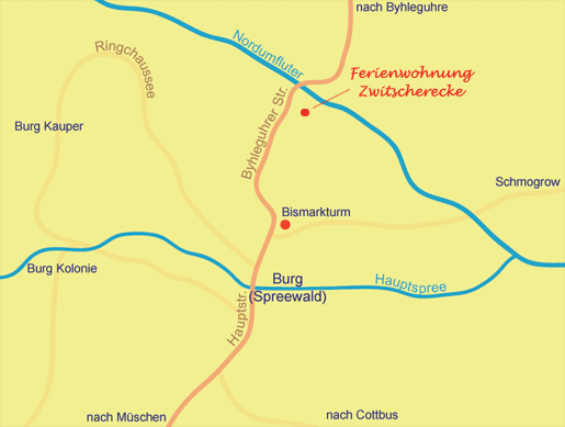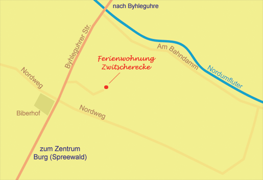 Unsere Zufahrt befindet sich zwischen dem Nordweg und der langen Brücke des Nordumfluters. Aus Richtung Burg-Zentrum ca. 3km, vorbei am Bismarckturm und Biberhof, kreuzt der Nordweg die Landstraße. Gleich danach nehmen Sie die 2. Abfahrt rechts oder aus Richtung Byhleguhre kommend nach dem Nordumfluter die 2. Abfahrt links. An der Weggabelung halten Sie sich rechts und gelangen nach ca. 200m zu unserem Grundstück. Hier endet auch der Weg.